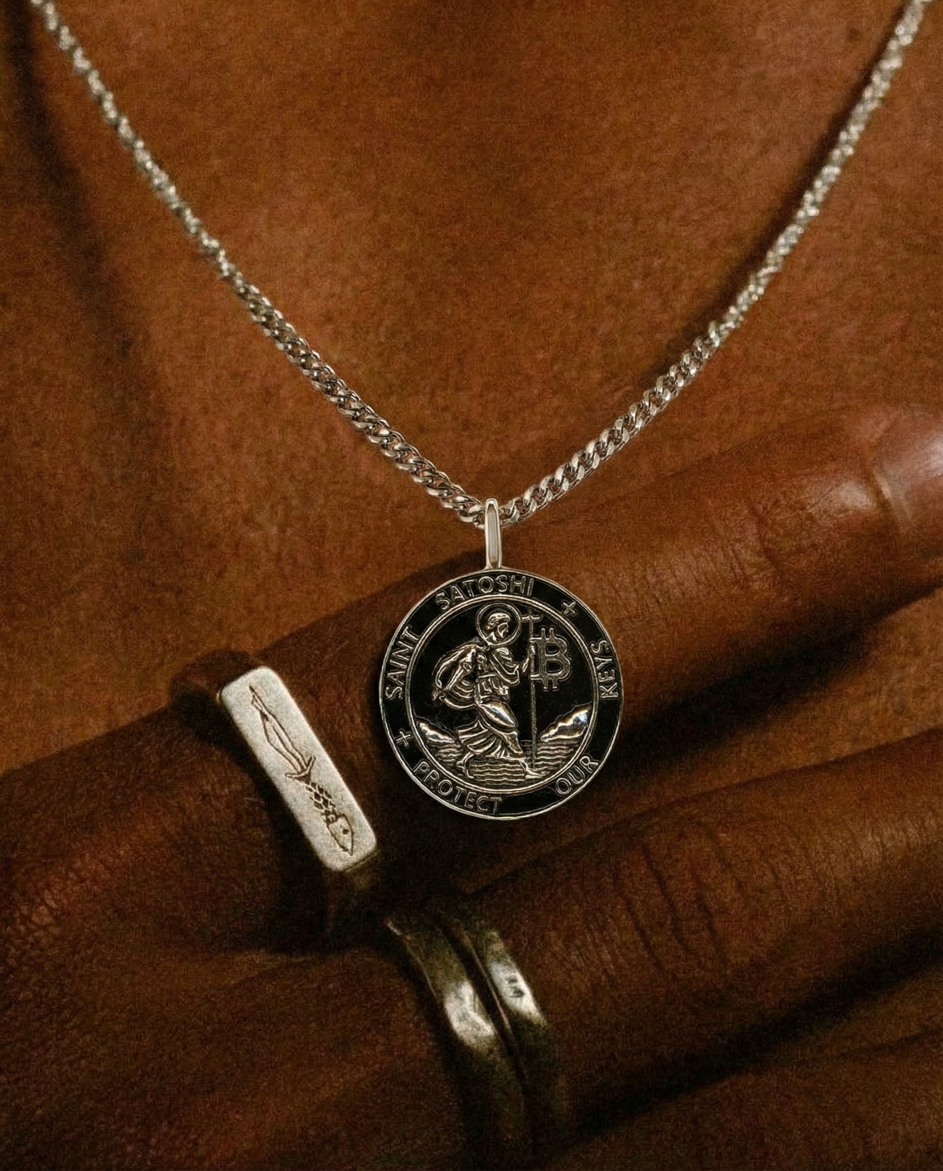 Surrounding the figure are the solemn words: “SAINT SATOSHI” and “PROTECT OUR KEYS” — a nod to the foundational Bitcoin principle: not your keys, not your coins. Each pendant is strung on a finely crafted silver chain, resting elegantly against the wearer as both statement and safeguard.